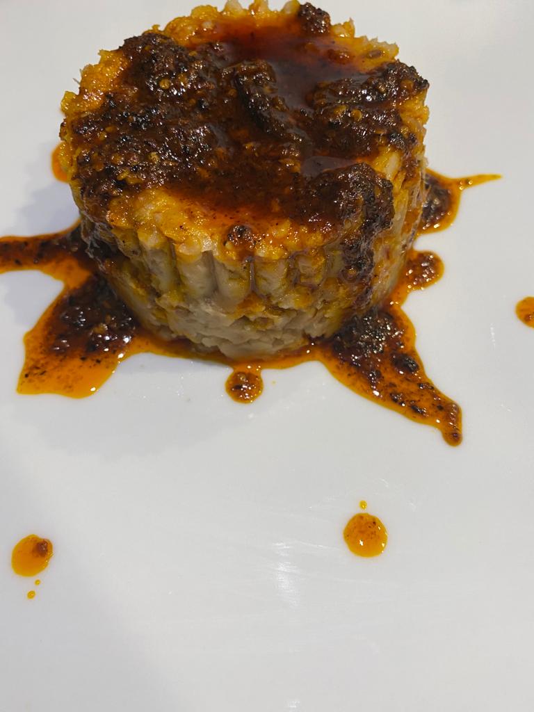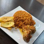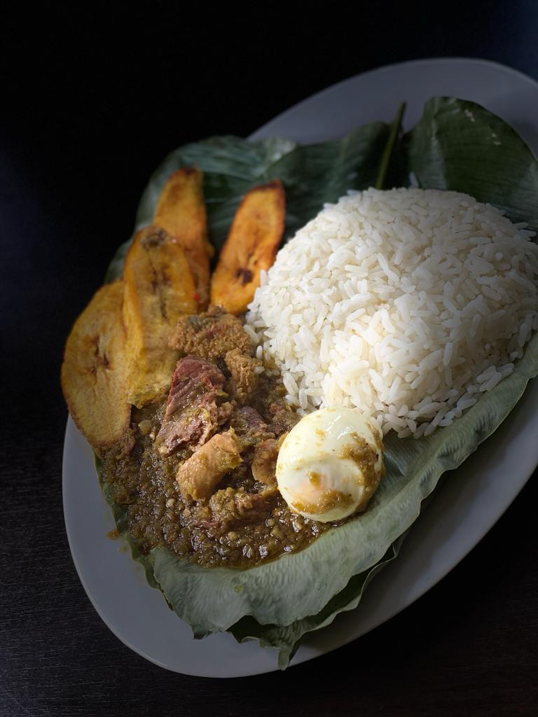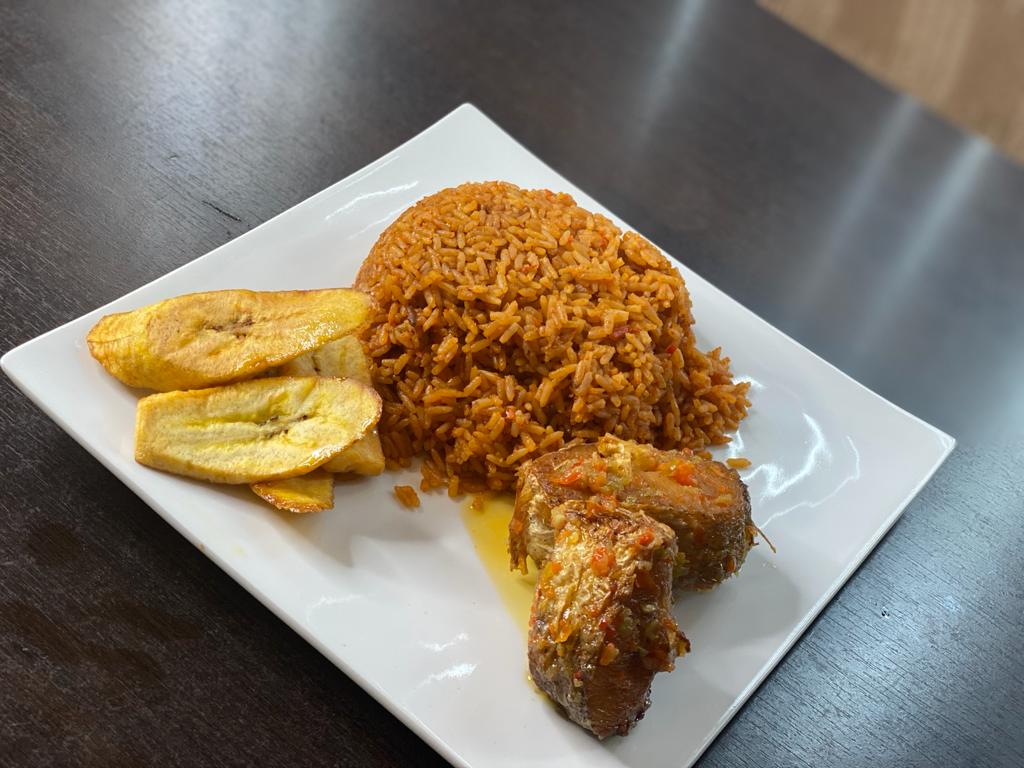 Plain Rice and diced assorted meat Red pepper sauce served with plantain