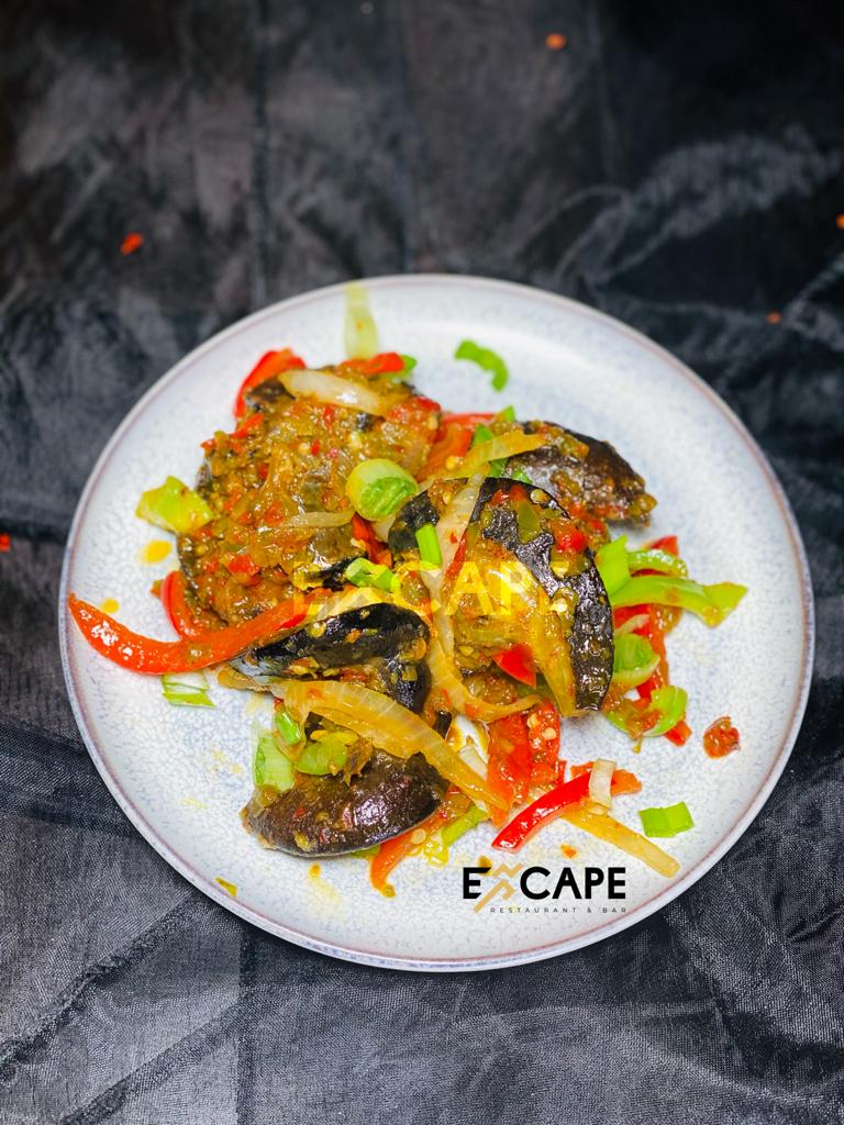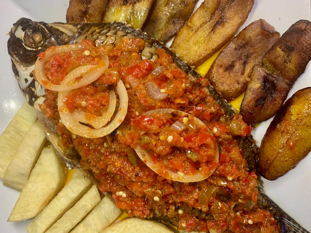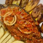 A Choice of tilapia, or catfish in stew. Can be served with any soups; efo, okra, etc or White Rice
