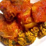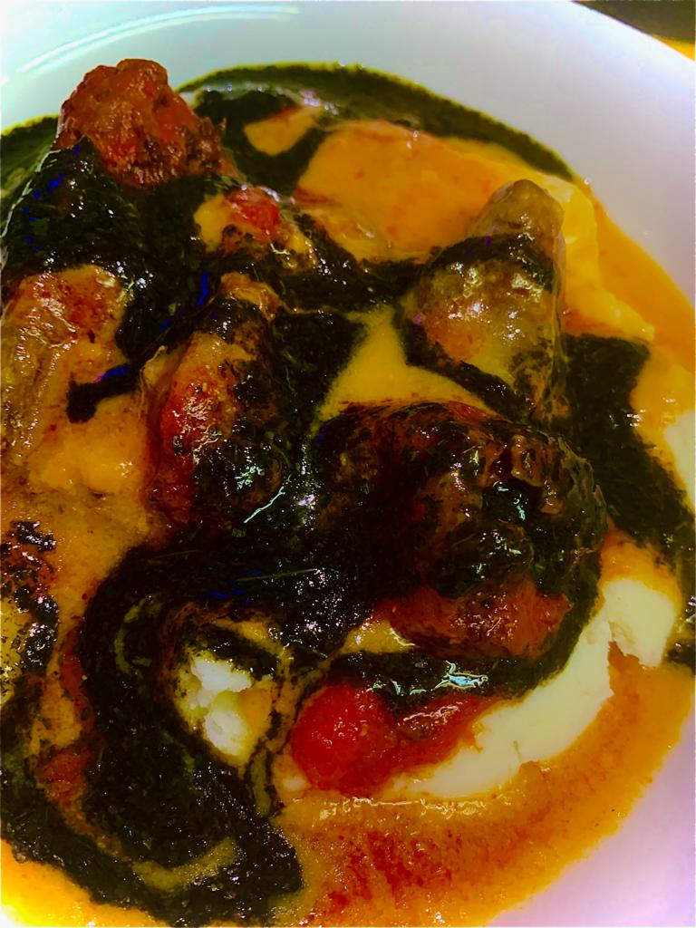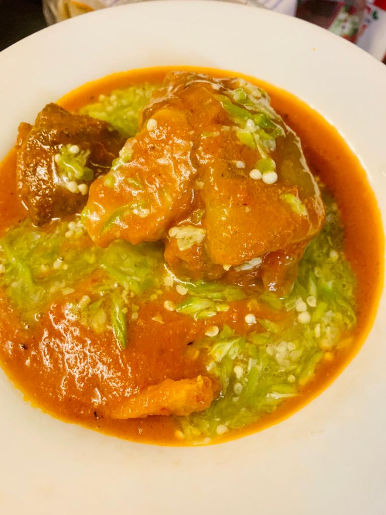 Ewedu and Red stew served with assorted meat, fish, chicken or beef only and a choice of Pounded Yam, Semovita, Amala, Eba or Fufu